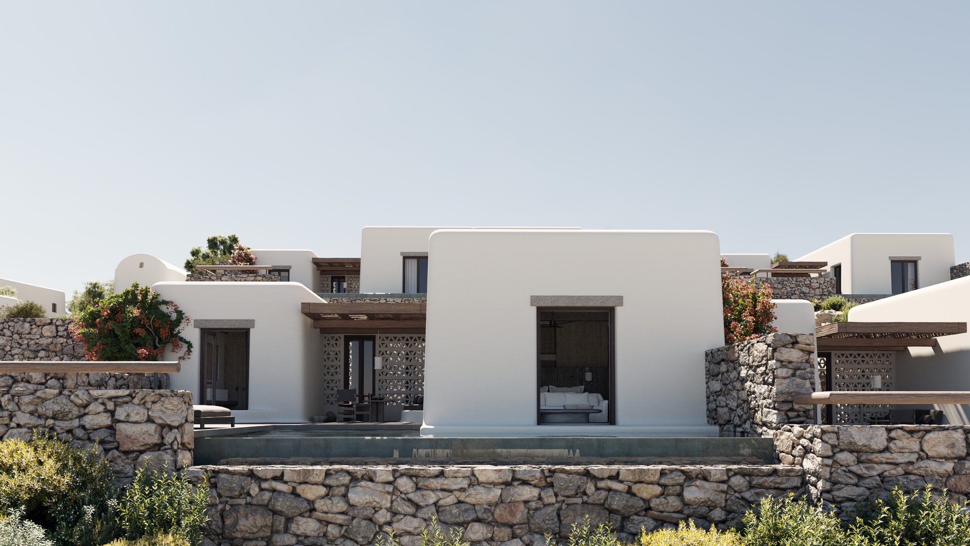 OUR ELEGANT MYKONOS SUITES ARE DISCREETLY EMBEDDED INTO THEIR NATURAL SURROUNDINGS CREATING A HAVEN OF CALM AND REFINED ELEGANCE.