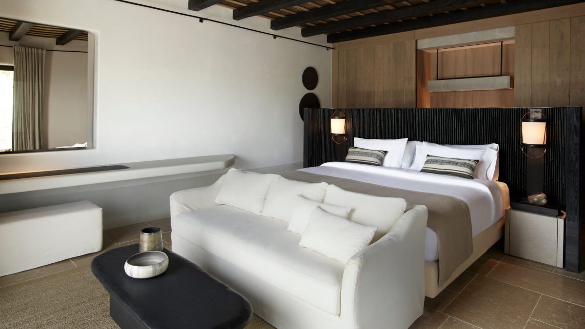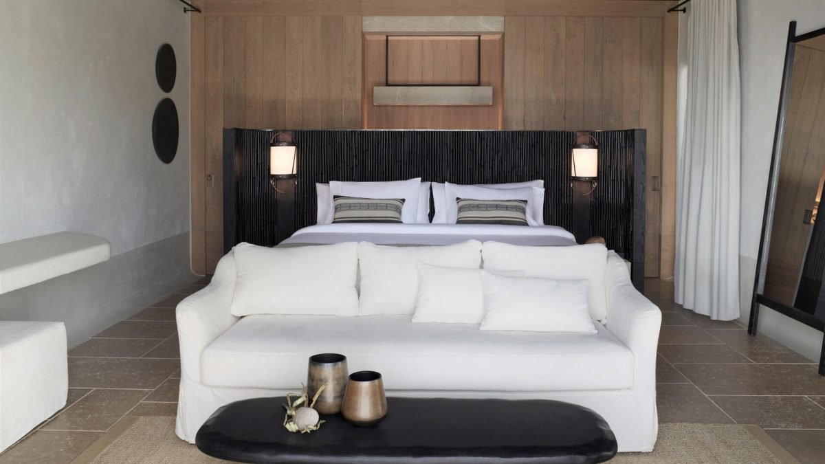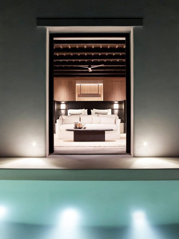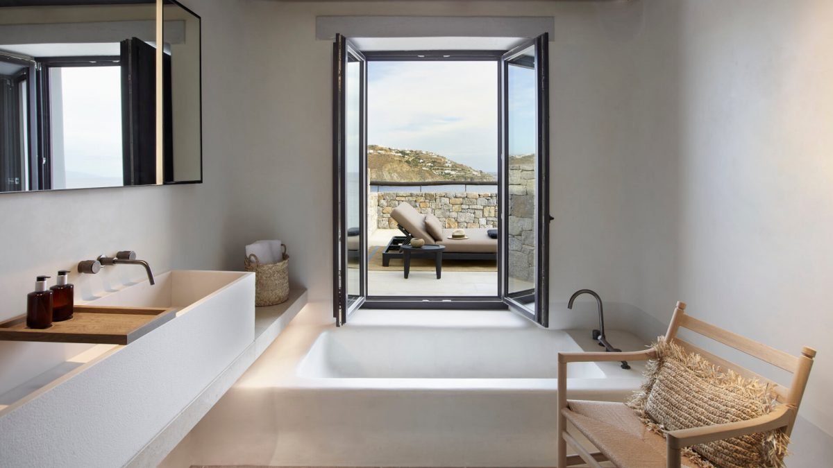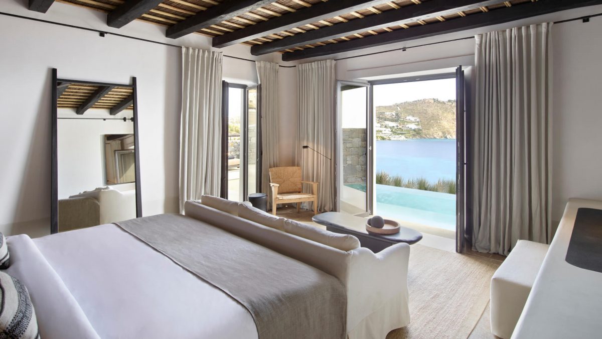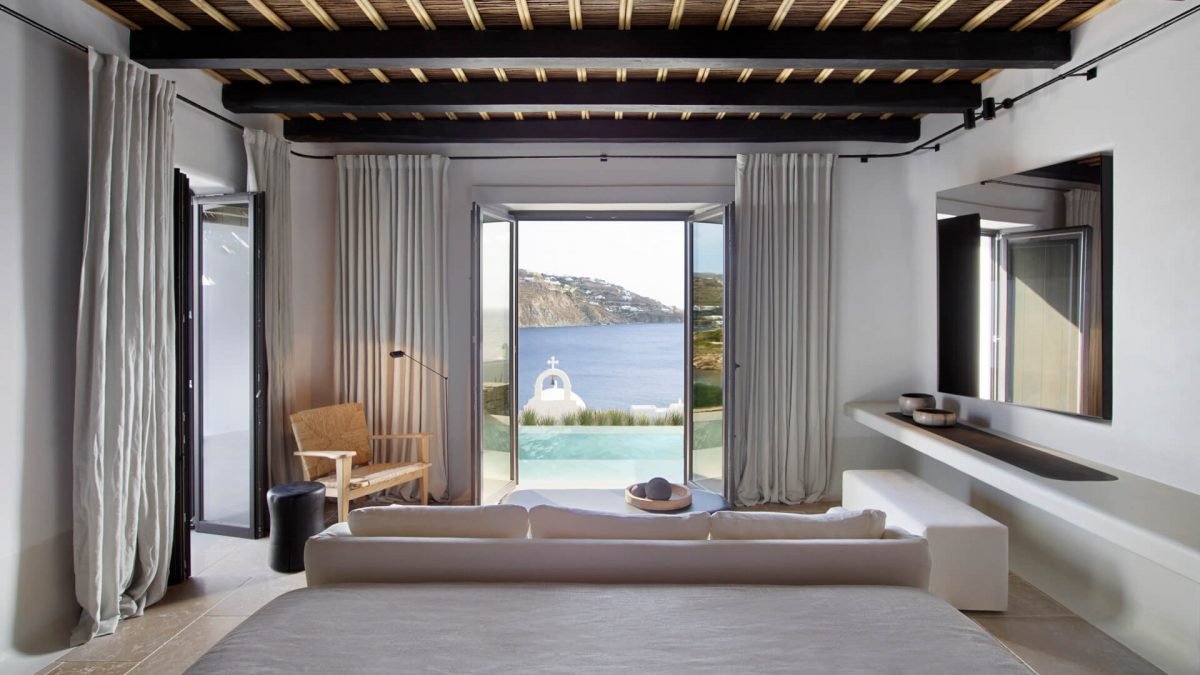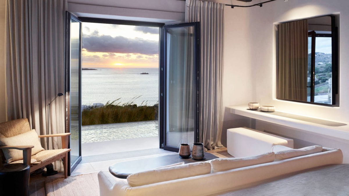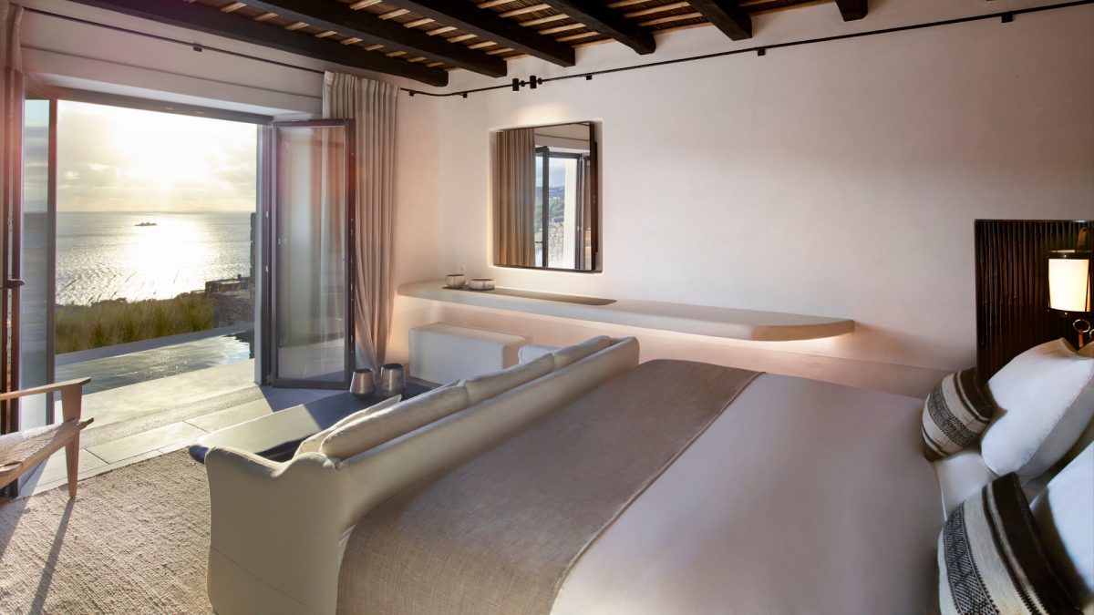 The sea view suites are amply generous in size and can accommodate up to four persons. All interiors are adorned with natural materials, delicate decorative details, luxurious furnishings and neutral color tones reflecting the minimalist Cycladic beauty and genuine character of Mykonos island.